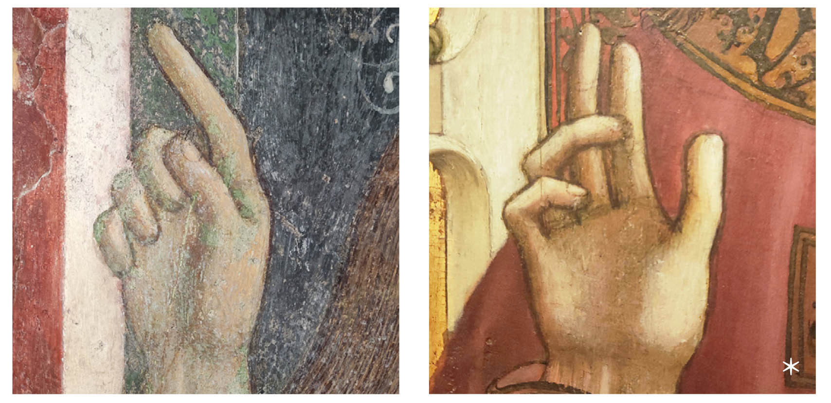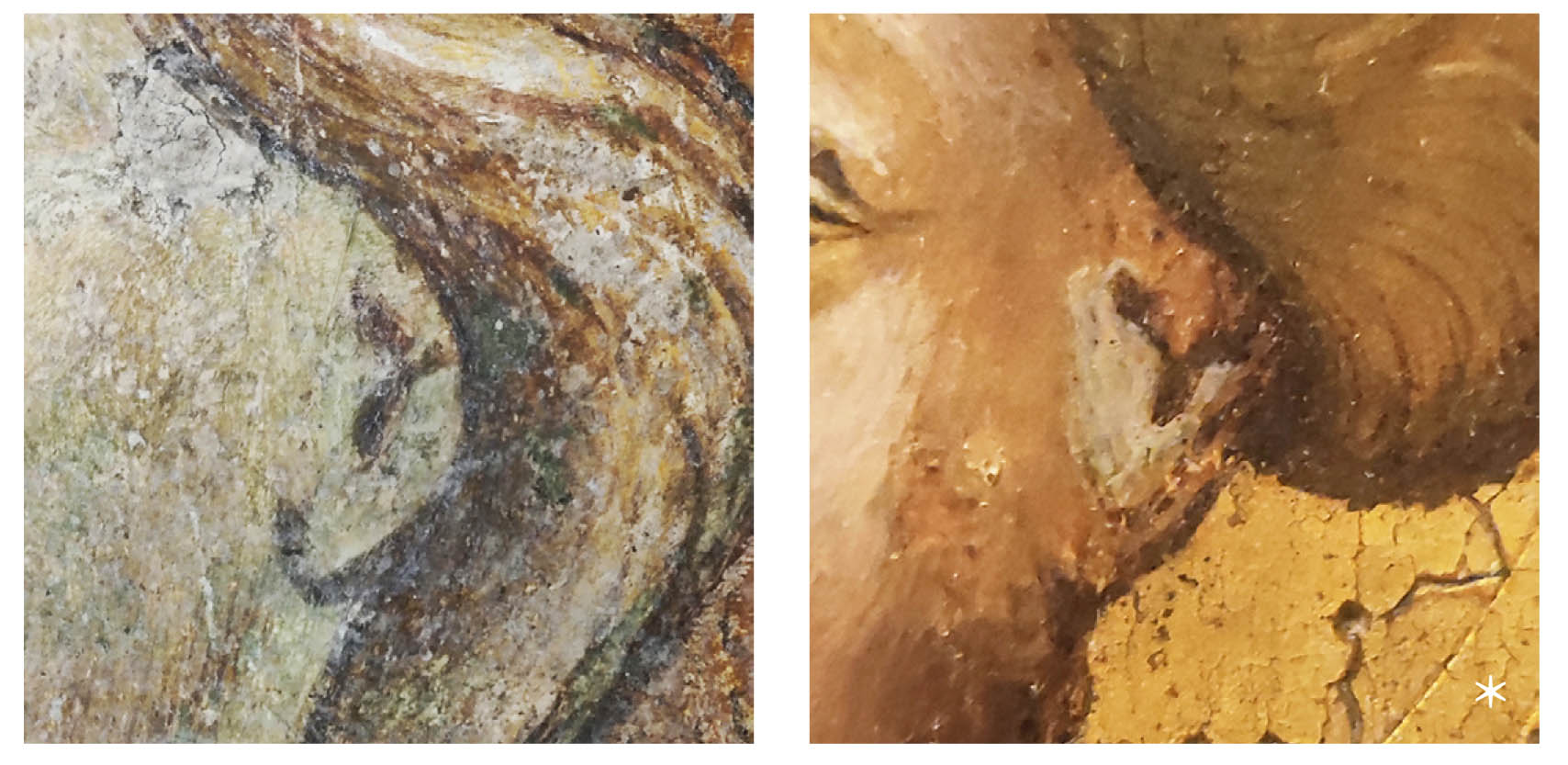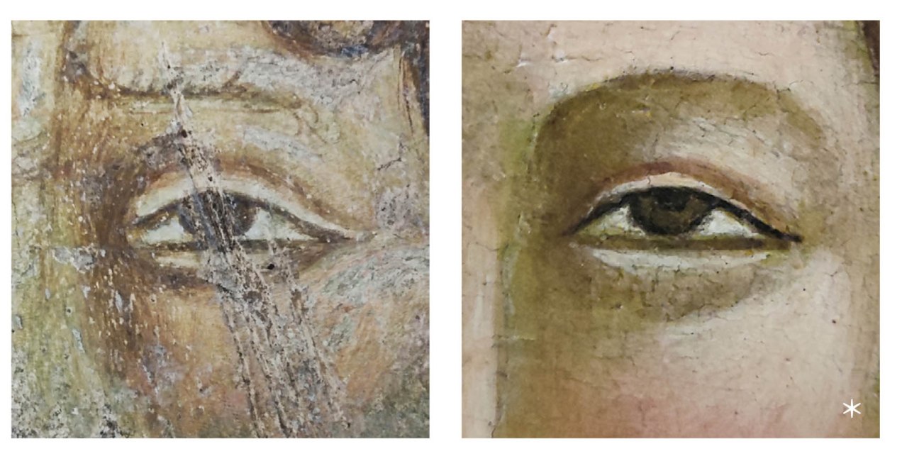 Mario Ritarossi avvia la sua ricerca attratto da una sfasatura del piano del dipinto, da una sovrapposizione inspiegabile per cui la mano più antica sembra imporsi, illogicamente, a quella più recente, cui si deve la contigua teoria di santi dai tratti che si ispirano – quanto poco appropriatamente, Ritarossi lo lascia solo intendere – all’egemone umanesimo quattrocentesco.