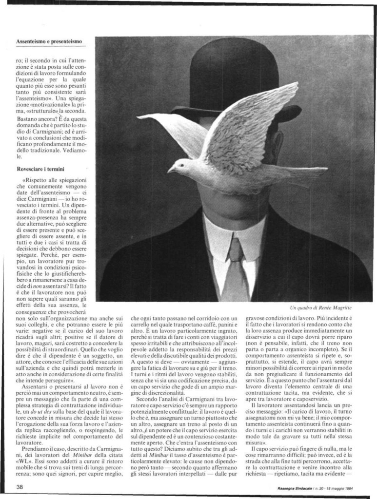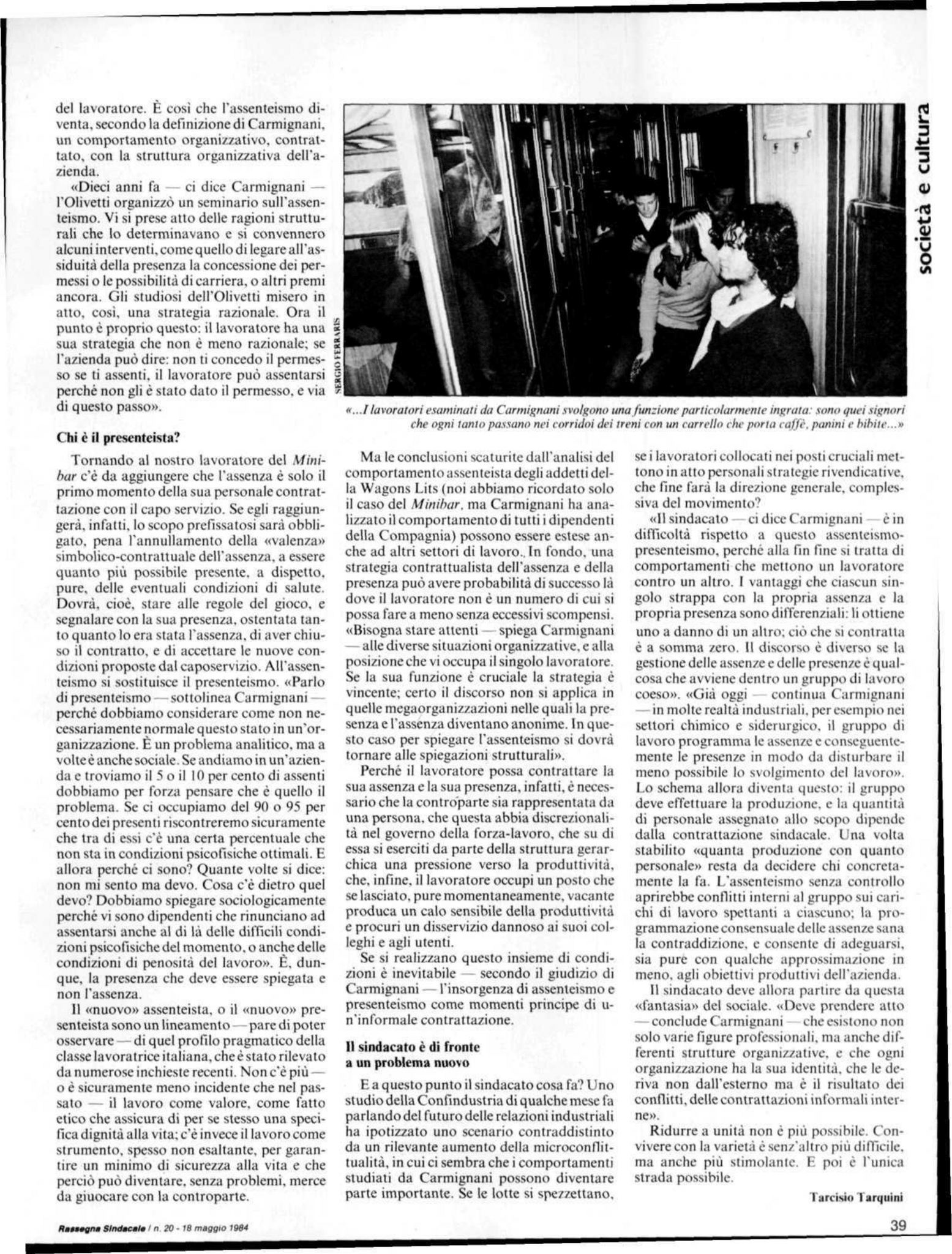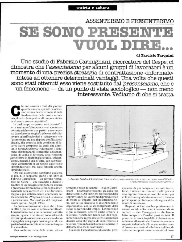 Fu a metà degli anni ottanta, per esempio, che un giovane sociologo, Fabrizio Carmignani, allievo di Aris Accornero, principe dei sociologi del lavoro, affrontò il tema dell’interminabile e irrisolvibile contenzioso sull’assenteismo operaio (con i sindacati, ovviamente, sotto tiro) cambiando prospettiva: interroghiamoci, scrisse, non sull’assenteismo ma sul presenteismo, sulle ragioni per le quali i lavoratori vanno al lavoro o non su quelle per le quali si assentano. In questo modo, indagando sulla presenza arriveremo a capire meglio anche l’assenza. Carmignani andò sul campo – la società che gestiva i vagoni letto dei treni italiani, dove i tassi di assenza erano notevoli e soprattutto in grado di paralizzare il servizio –, compilò questionari, parlò con i diretti interessati, i lavoratori sotto accusa, elaborò una teoria che mise nero su bianco in un libro che a me sembra fondamentale ancora oggi per insegnare un metodo che sappia proiettarci un po’ più in là delle chiacchiere da bar che si incontrano non dentro i bar, come si vorrebbe,ma sulle pagine di tanti autorevoli giornali. Il libro di Fabrizio Carmignani venne pubblicato dall’editore Angeli con il felice titolo “Assenteismo e presenteismo. Due strategie del comportamento operaio”: strategie, appunto, razionali, che esigevano risposte altrettanto razionali, non tiritere moralistiche. Era il 1984, ne scrissi, intervistando l’autore e raccontando il suo saggio, su Rassegna Sindacale, dal cui archivio elettronico ho copiato le pagine che trovate nelle immagini allegate a questo post.