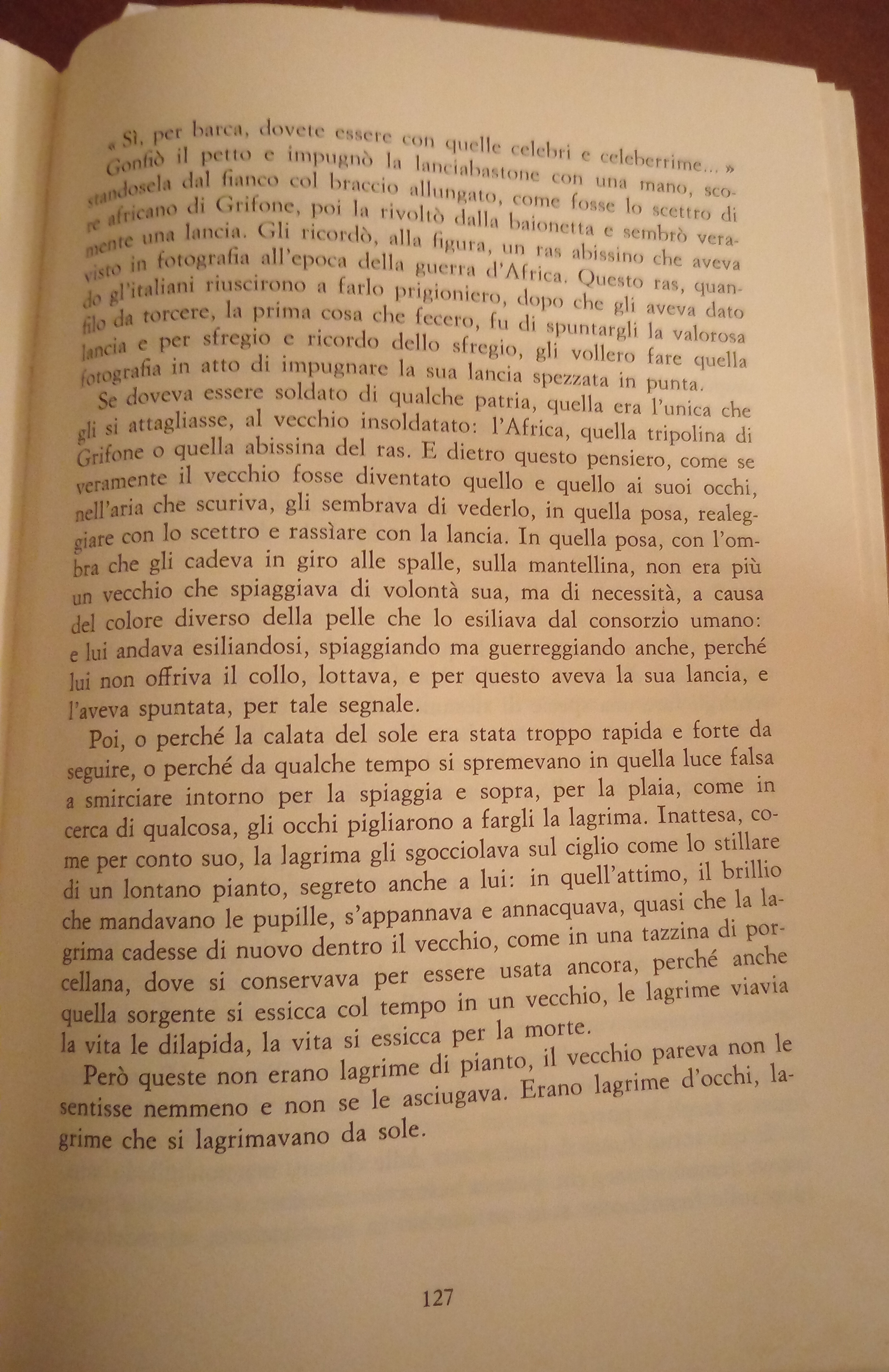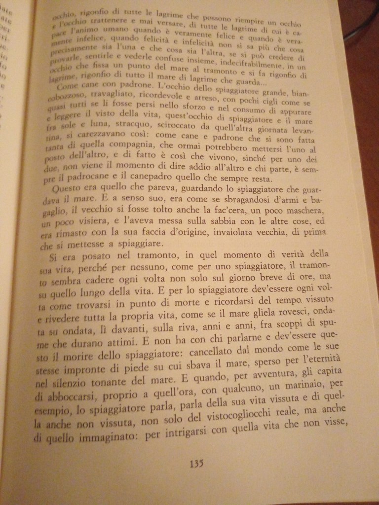 Ma quale felicità-infelicità può muovere ormai lo spiaggiatore che tante ne ha viste e non si fa più meraviglia? Sono lagrime che ci sono ma non servono a piangere. E che forse proprio per il fatto di starci, là dentro l’occhio senza servire a niente, ogni tanto si lagrimano da sole.