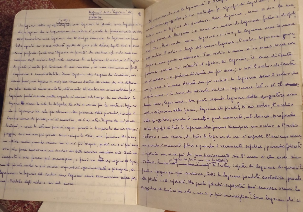 In un vecchio quaderno, che però ho tenuto sempre sott’occhio, rileggo alcune suggestioni d’arrighiane di quasi quaranta anni fa, tali rimaste, nonostante i reiterati propositi di tirarne fuori qualcosa in più. In queste righe che pubblico di seguito ci sono spunti per quella “fenomenologia delle lagrime” in D’Arrigo” che avrei voluto delineare, approfondendoli e completandoli con i corrispettivi interni trovati anche in “Cima delle nobildonne” e, al di fuori, nella tradizione letteraria europea. Un’opera al di là delle mie forze, come può supporre chi sa di cosa stiamo parlando. Si tratta, quindi, di brevi appunti che rispolvero per il cinquantennale di Horcynus Orca, solo per testimoniare una lunga passione.