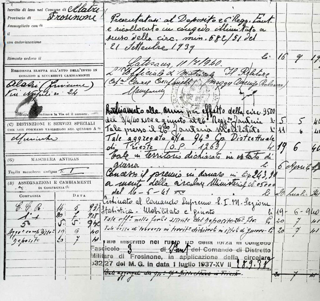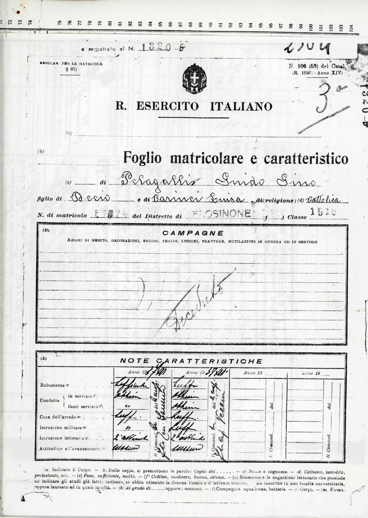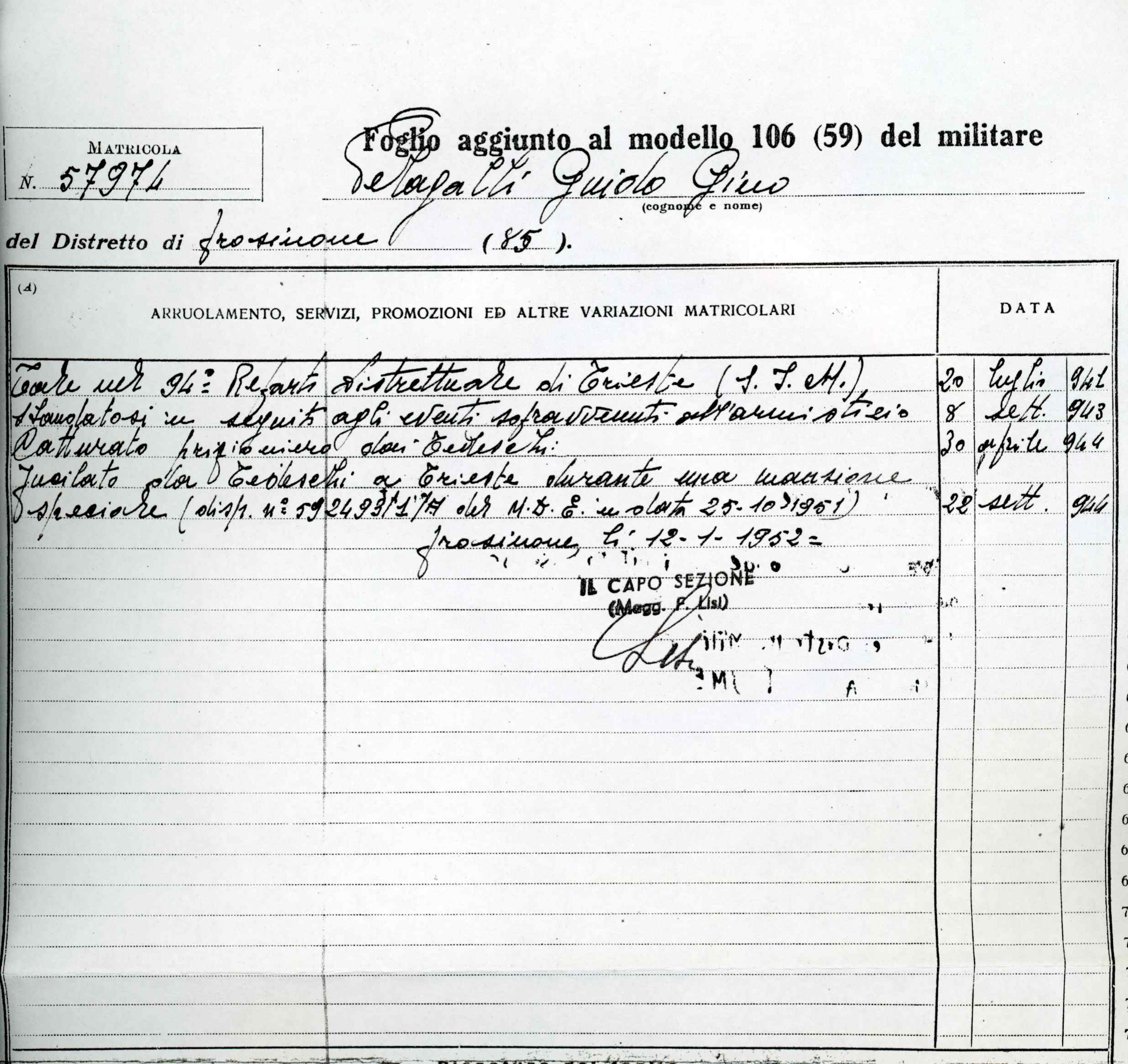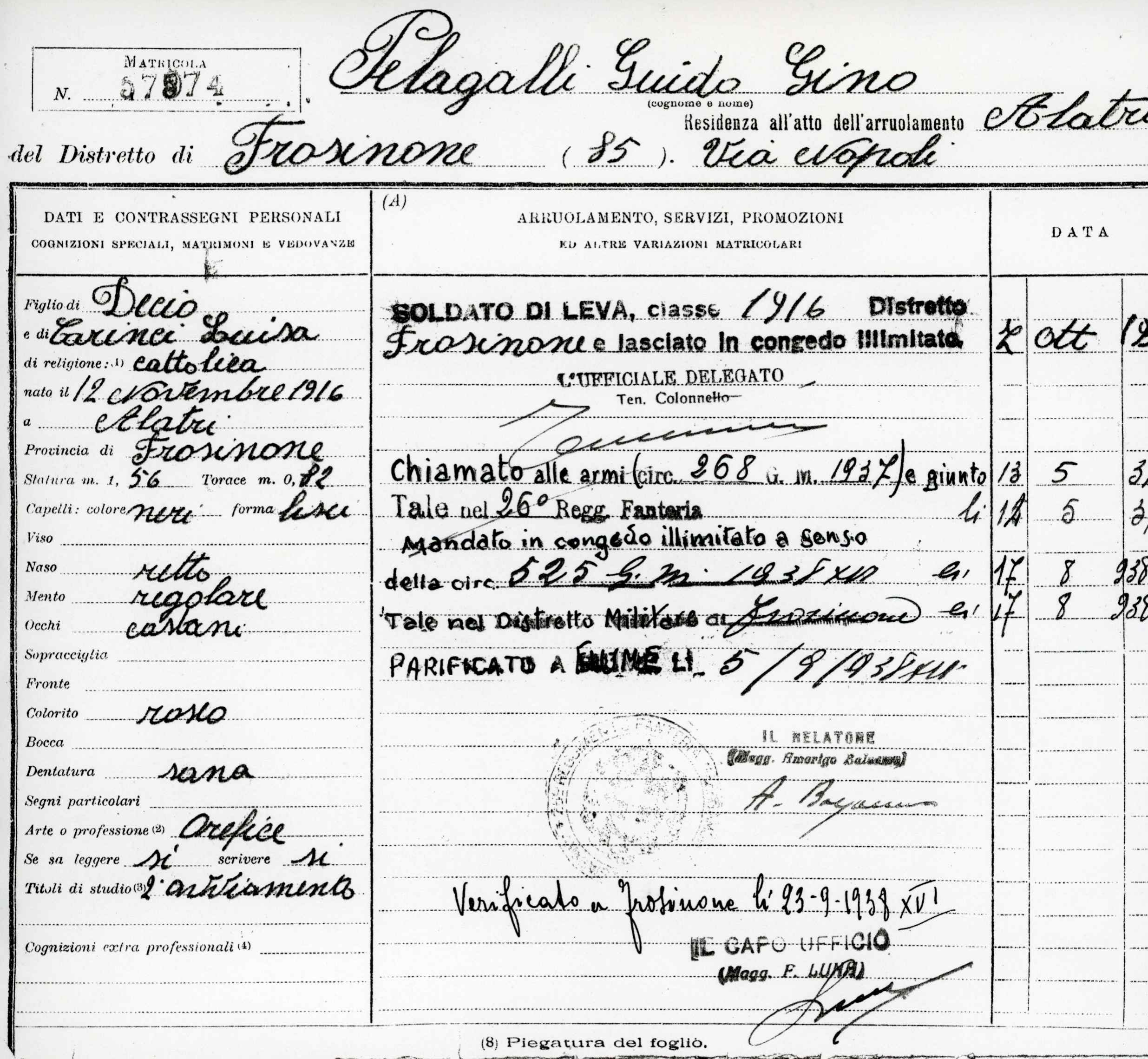 Vittorio Pelagalli è stato una persona nota ad Alatri, uno stimato professionista – segretario comunale e provinciale in diversi enti locali italiani – eppure la tragedia che aveva colpito la sua famiglia non era conosciuta da molti e, soprattutto, non ha dato mai luogo (a quanto so e ricordo) a un momento di celebrazione cittadina. Ho quindi pubblicato la foto inviatami da Paola, e subito dopo mi è stata fatta recapitare da un amico collezionista, che non cito perché so che non ama comparire, la copia del foglio matricolare di Guido Gino: quattro fogli, l’ultimo aggiunto dopo la morte, che chiarisce la ragione della fucilazione,.