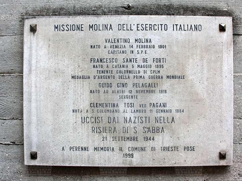 VENNERO CATTURATI A TRIESTE, dove – in contatto con le truppe anglo-americane che avanzavano verso il Nord Italia – trasmettevano, con una radio clandestina. informazioni sugli spostamenti delle colonne tedesche stanziate nel Friuli Venezia Giulia.Questa vicenda viene ricordata come l’OPERAZIONE MOLINA, qualche racconto si trova sul web, come sul web si trova un rapido resoconto del processo che individuò il presunto colpevole (un amico, per danaro) della “soffiata” che portò a scoprire la casa dalla quale la radio trasmetteva i suoi messaggi e all’arresto dei responsabili. La donna del gruppo era la proprietaria dell’abitazione, che per necessità aveva trasformato in pensionato. Probabilmente sapeva poco o nulla dell’attività di spionaggio del capitano Molina, o forse fingeva di non vedere. Sulla sua vicenda è stato pubblicato un libretto illustrato per bambini (autori Alessandro Slama e Roberta Zucca), “LA TRISNONNA CLEMENTINA E LA RISIERA DI SAN SABBA”, uscito nel 2020 – l’ho acquistato un paio di mesi fa in questa edizione – ma presumibilmente ora riedito perché ancora in questi giorni trovo annunci (sempre sul web) di sue presentazioni.